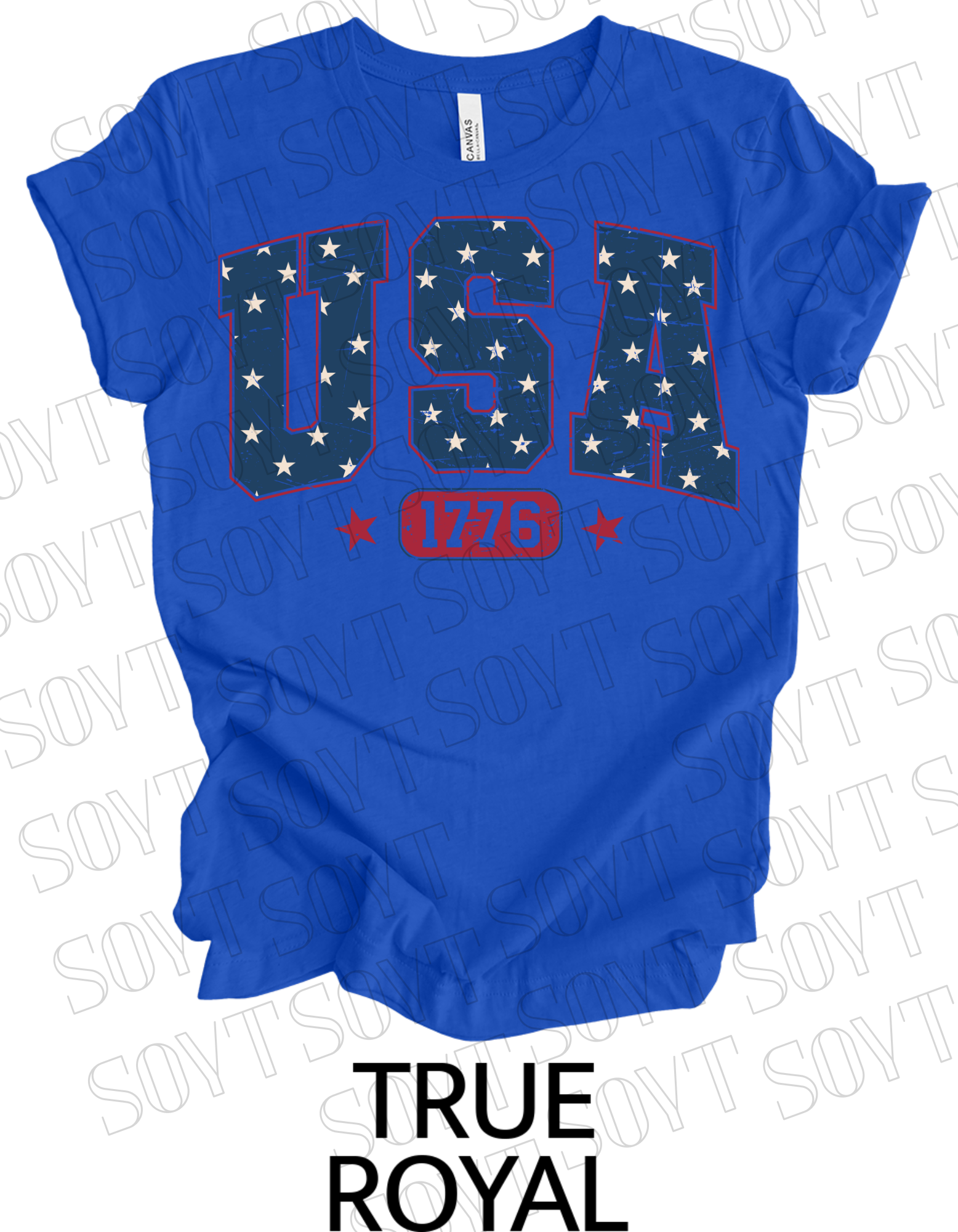 Design: Vintage-style “USA 1776” print with distressed stars and bold typography